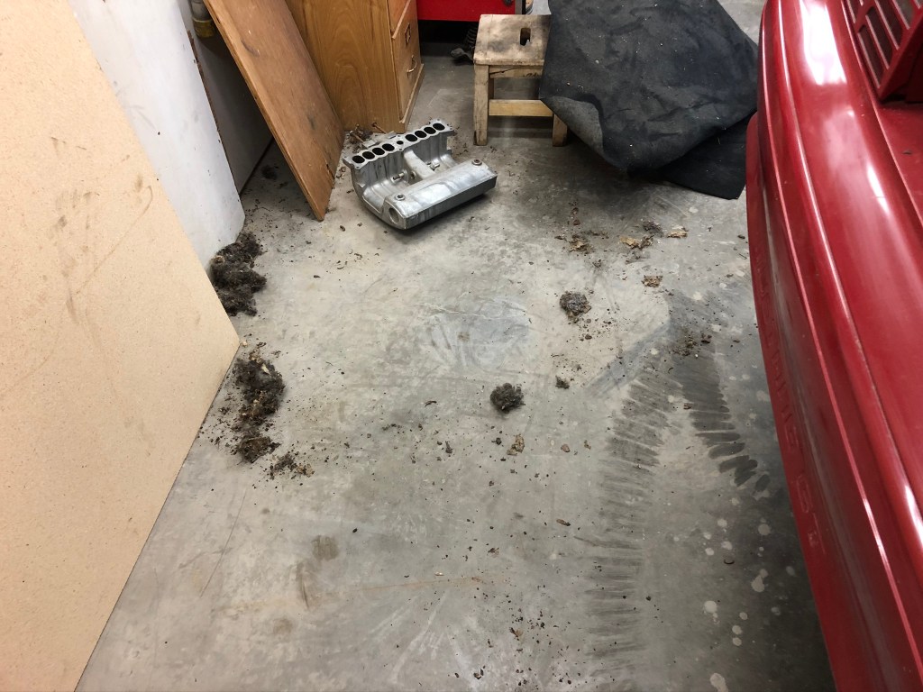 At this point I had the car but it was hard to move or push. I changed the oil and got a battery to try and start it, and after a few taps on the starter it cranks. I sprayed some brake cleaner in the intake and tried to start it again but it popped back and started leaves and debris on fire, and in a panic we get the fire out!